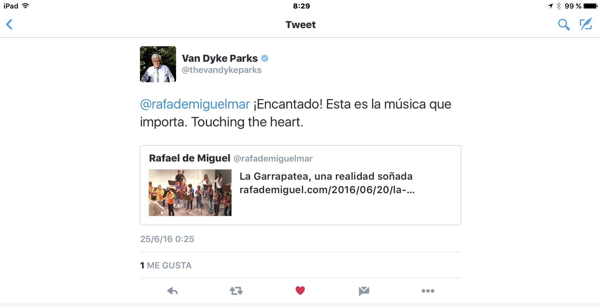 Es un honor y un placer que un genio de la composición y amante de los arreglos de cuerda como Van Dyke Parks, se muestre encantado por el aprendizaje musical de los alumnos de la escuela de música La Garrapatea de Santa Cruz de Tenerife. Lo dejó reflejado en su cuenta de twitter.